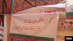 په اسلام اباد کې د مظاهرینو لخوا لګول شوي دغه احتجاجي کیمپ کې په لګول شوؤ بینرونو دپاکستان په حکومت تور لګول شوی چې ترهګرو سره اړیکې لري.
